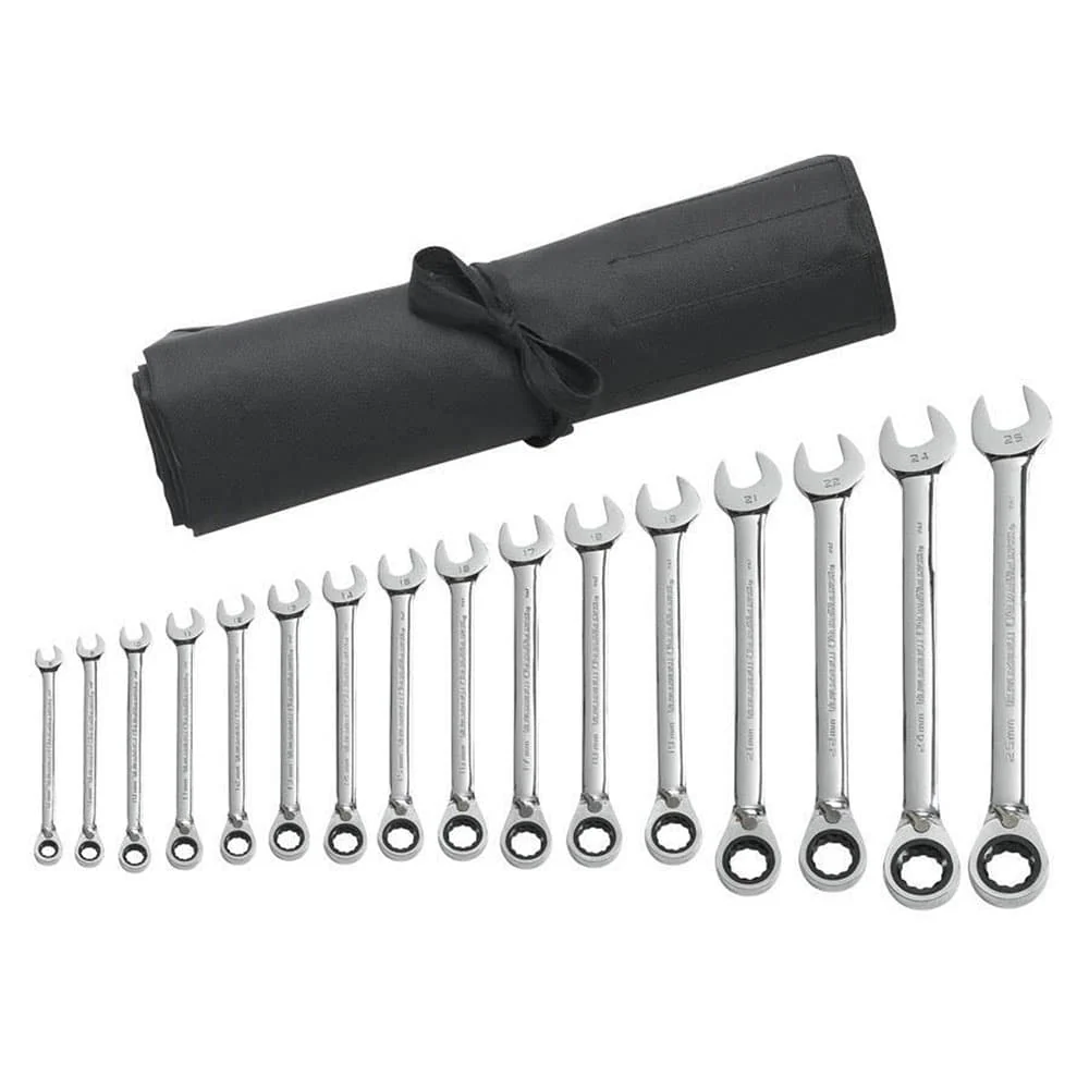 GearWrench 9602RN 16 Pc. 72-Tooth 12 Point Reversible Ratcheting Combination Metric Wrench Set with Tool Roll