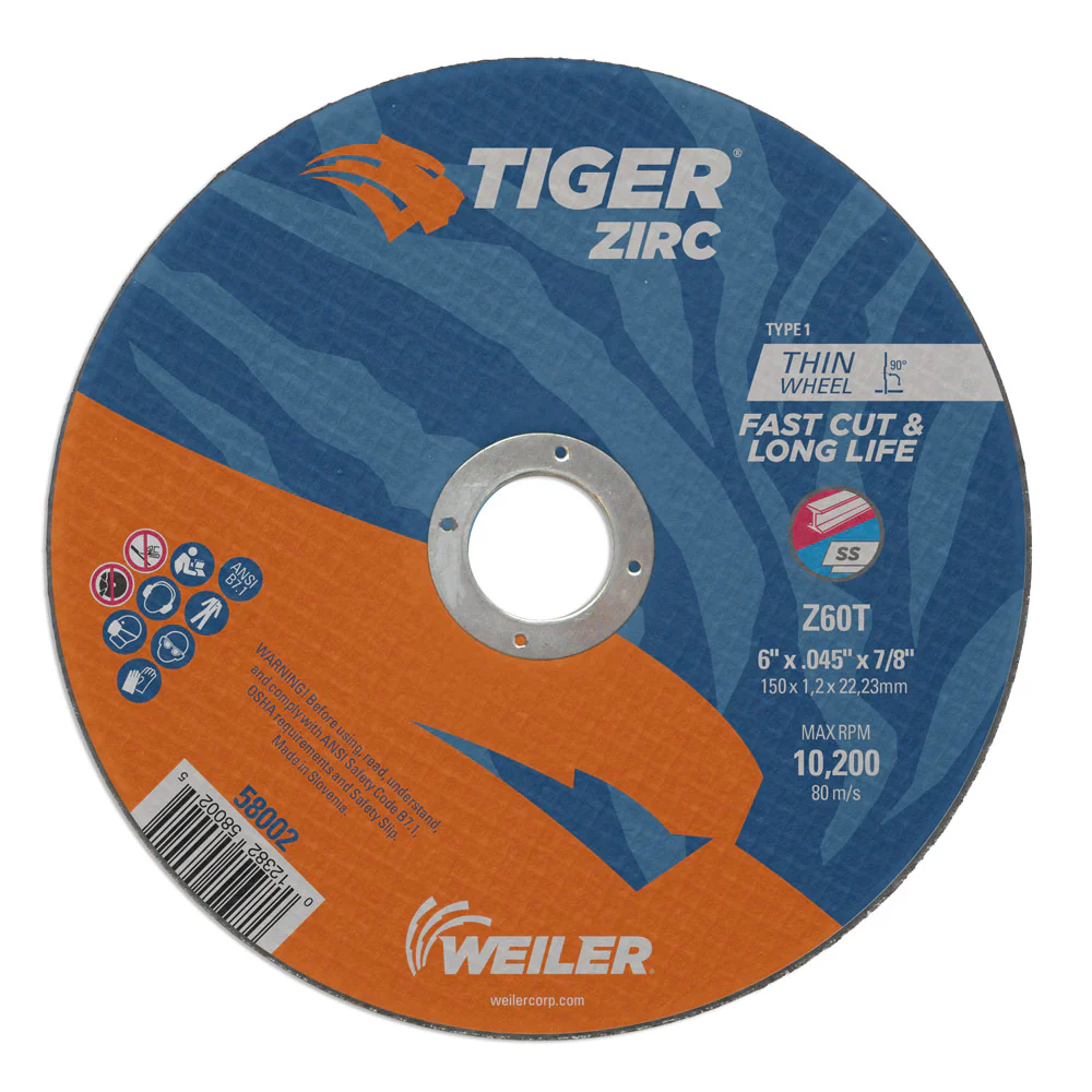 Weiler 58002 6" x .045" Tiger Zirc Type 1 Thin Cutting Wheel, Z60T, 7/8" A.H.