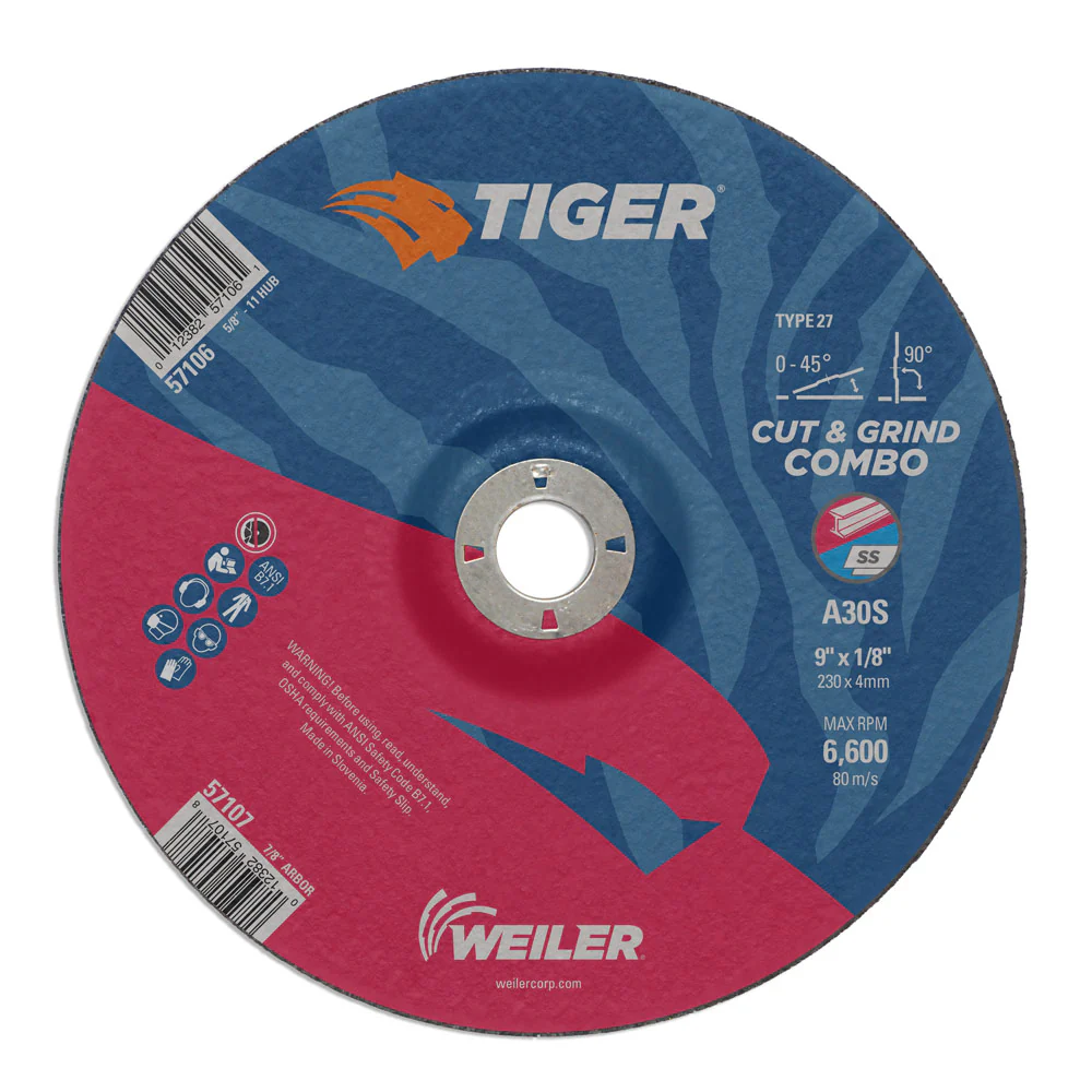 Weiler 58050 4-1/2" x 1/8" Tiger Zirc Type 27 Cut & Grind Combo Wheel, Z30T, 5/8"-11 UNC Nut